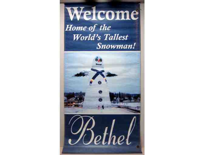 This banner welcomed many people to Bethel as it hung in one of the gateways to the village.  Now it has been retired and is ready to add character to your home or business, inside or out.  This banner features a photo of Angus, King of the Mountain, who was crowned the world's tallest snowperson at 113'7" tall when he was built in Bethel in 1999.