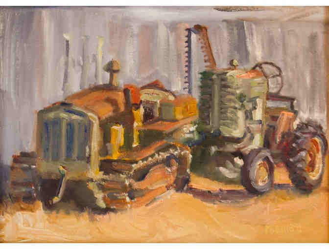 Artist Margaret Elliott painted "Two Tractors" at Cow Track Ranch in Nicasio. It was a very hot day at the farm and a charming wedding party was just clearing out of the big barn when the artist captured this image. The warm color palette evokes the dusty brown summer landscape of Marin County. The soft lines defining the tractors make them friendly aspects of running a farm.