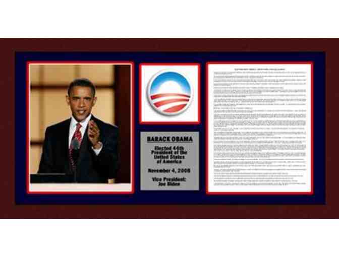 "Yes we can!" repeated followers in Chicago's Grant Park on a warm fall night. The date was November 4, 2008 and the people of the United States of America just elected Barack Obama to serve as the country's 44th President. History was made as Obama became the first African American to win the US Presidency. Walking out onto a stage surround with people as far as one can see, Obama spoke as millions watched worldwide. This limited edition masterpiece collage, which features an 8x10 photograph of Obama, the Obama campaign logo, a commemorative nameplate and a complete transcript of his Election Night Speech, comes professionally double matted and framed.