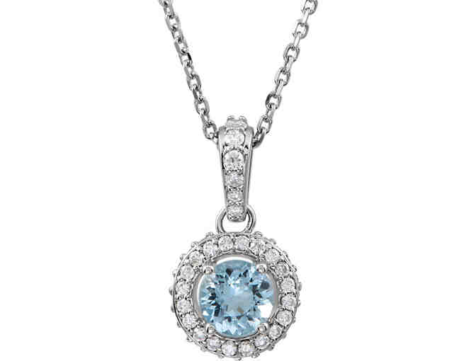 A cool splash of blue! Gorgeous diamond and aquamarine necklace in 14k white gold! This beautiful and elegant 18" necklace boasts a 5 mm round genuine aquamarine center stone surrounded by 1/4 ct of genuine brilliant round diamonds. This necklace is dazzling! Gorgeous color and sparkle! A classic yet modern necklace that fits any occasion! Gift box included.