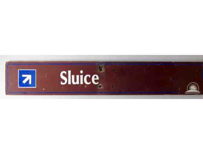 Your ski house is not complete without this genuine retired Sunday River trail sign. Sluice is located on Barker Mountain, connecting Three Mile Trail to Lazy River, popping out just in time to dip into the Last Tango glade - an excellent spot to find under-skied fresh snow on a powder day. The sign features Sunday River's old 18-point sun logo and the patina you would expect from being bolted to a tree outside for years. This is NOT a reproduction and it is extremely difficult to find genuine old trail signs. Don't miss your chance to own a little piece of ski history!