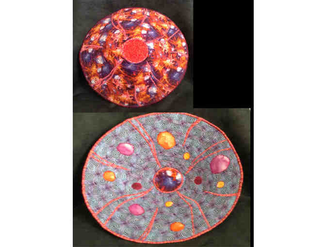 Shallow cotton fabric bowl, functional or for use as wall art. Blue/Purple circular design with bright planet like orb applique. Outside is Cotton fabric of reds, oranges and purple. Bowl is reversible. Measures approx 14" x 6.5". Please bid generously!