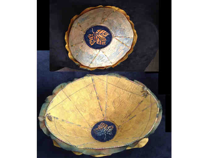 Rigid fabric bowl of cotton batik materials, functional or for use as wall art. Mustard gold on inside with batik leaf applique. Outside is complementary batik fabric. Bowl measures approx 11" x 6.25". It is edged with silk ribbon and antiqued gold metal leaves. Please bid generously!