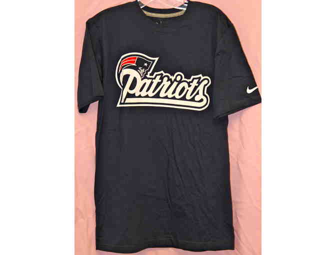 This is a great Nike Script Logo Tee-shirt with the New England Patriots team name across the front. It is navy blue and the fabric is 100% cotton. Size: Men's medium
