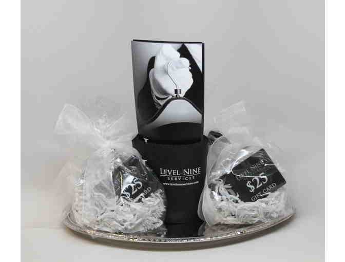 Make sure your time is invested, not spent. Welcome to Level Nine, where time is available and you are the priority. Gift basket includes $100.00 in gift cards good toward all Level Nine services. No expiration date noted