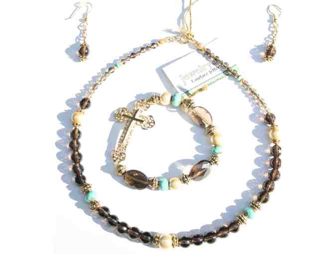 Bracelet, earrings and necklace made with chocolate quartz, czech glass, and vintage faux pearls. Stretch bracelet features a vintage crucifix. All items are of the "Alexandria" collection and are made by local jeweler, Candace Jefferies.