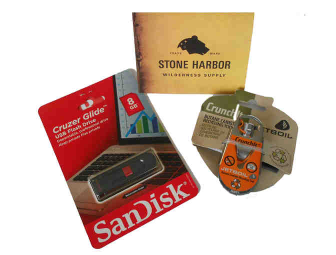 A little bit of everything. This combo package has an 8 gb flash drive, a Jetboil Crunchit tool and if need something to go with it this pocket collection - a $20 Gift Card to Stone Harbor in Grand Marais.