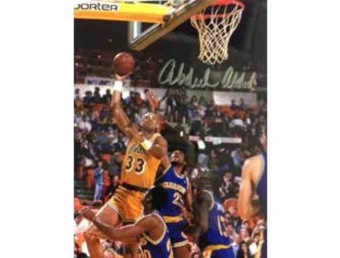 This is an authentic, autographed photo of Kareem Abdul Jabbar of the Los Angeles Lakers. Jabbar, who is now retired, is in the basketball hall of fame and is the NBA's all-time leading scorer with 38,387 points.