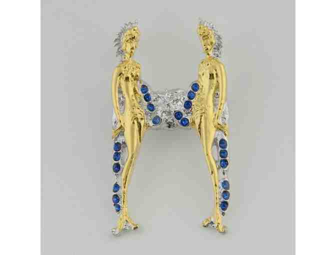 THIS IS YOUR GOLDEN OPPORTUNITY TO OWN A GENUINE ERTE ART DECO CREATION! From an original design by the “Father of Art Deco”, Erte’s famous “Alphabet” series was first a Suite of Serigraphs and then a priceless collection of figures cast in precious metals set with gemstones. We are pleased to present this sparkling Pendant/Brooch depicting the letter “D”, made of solid gold-plated Sterling Silver and hand-set Swarovski crystals, cast from the same mold used to create the original! This piece comes in a simple and pretty gift box with the Erte stamp on it. Officially Licensed by the Estate of ERTE, bearing the official stamp of his signature! Measures approx. 1.5" x 1", 3.6 grams (weight).