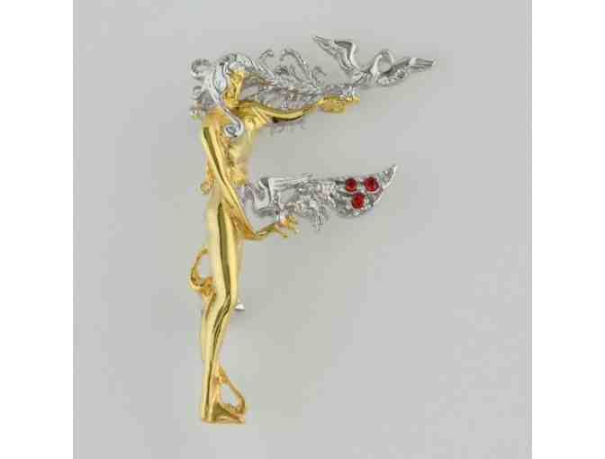 THIS IS YOUR GOLDEN OPPORTUNITY TO OWN A GENUINE ERTE ART DECO CREATION! From an original design by the “Father of Art Deco”, Erte’s famous “Alphabet” series was first a Suite of Serigraphs and then a priceless collection of figures cast in precious metals set with gemstones. We are pleased to present this sparkling Pendant/Brooch depicting the letter “D”, made of solid gold-plated Sterling Silver and hand-set Swarovski crystals, cast from the same mold used to create the original! This piece comes in a simple and pretty gift box with the Erte stamp on it. Officially Licensed by the Estate of ERTE, bearing the official stamp of his signature! Measures approx. 1.5" x 1", 3.6 grams (weight).