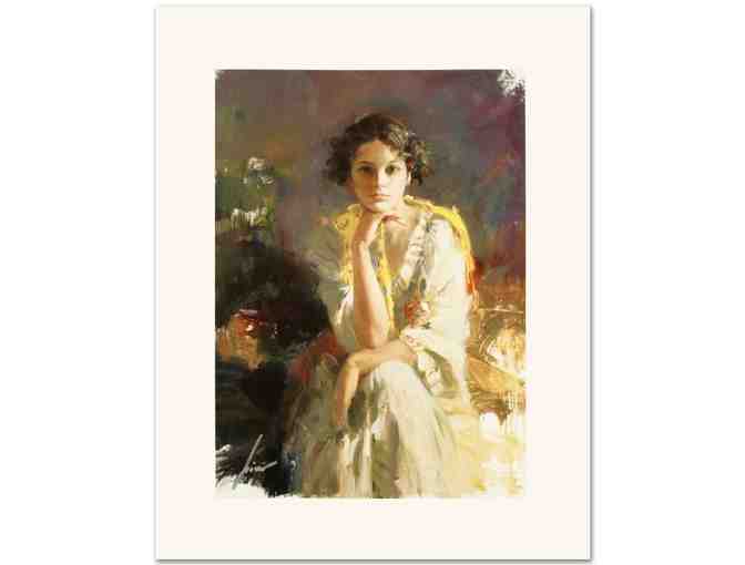 "Yellow Shawl" is a limited edition giclee on canvas, numbered and hand signed by Pino (1939-2010). Includes Certificate of Authenticity! Measures approx. 10" x 14" (image). ABOUT THE ARTIST: Born Guiseppe Dangelico in Bari, Italy on November 8, 1939, Pino began his studies at the city's Art Institute. He attended Milan's Academy of Brera in 1960 honing in on his talent for painting the human figure. During his two years at the academy, he was influenced by the the Pre-Raphaelites and Macchiaioli. His work was featured in numerous major exhibitions all over Italy and Europe from 1960 to 1979. Two of Italy’s largest publishers, Mondadori and Rizzoli, commissioned him to do book illustrations. |