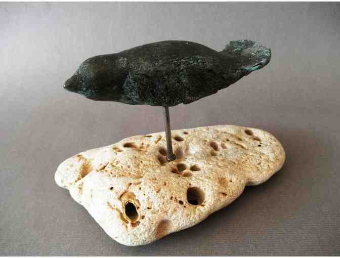 Ceramic with a metal patina surface treatment. Mounted with hardware on shell rock base from our local beaches. Approximately 5" x 5".