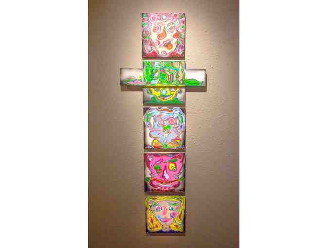 "This art piece was created as a tribute to the classic tale of Alice’s Adventures in Wonderland written by Charles Tutwidge Dodgson, who wrote under the pseudonym Lewis Carroll. This has always been one of my favorite stories. The characters feel like old, somewhat crazy family members. The painting style is inspired by the art of the Pacific Northwest, Aboriginal dream painting as well as the bold colors, movement, and fragment composition found in graphic novels and street art."