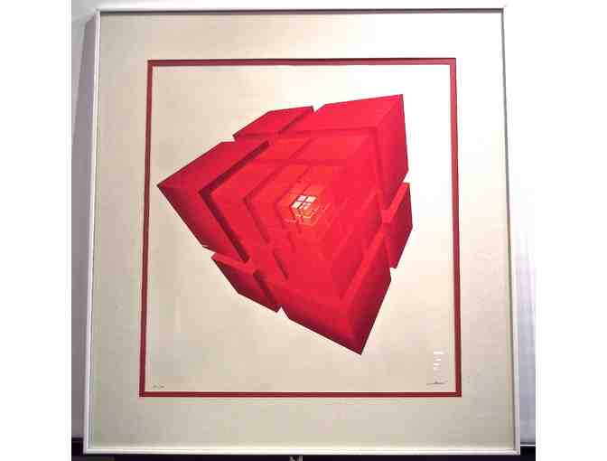 "Diminution Cube Red" by Jean Allemand Original Color Lithograph w/ White frame