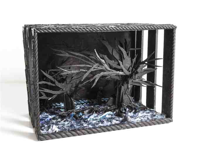 "Each of my boxes' title has come from Edward Gorey's abecedarian book, "The Gashlycrumb Tinies." The piece is centered around the photo I took in a local walnut orchard. With Exacto knife, I meticulously crafted the trees; cutting and gluing innumerable tiny pieces of balsa wood. I tried to create a somber, but whimsical diorama of a sublime, bucolic place. The figure in shadow lurking behind a tree is this redhead artist chick, who upon completion of this "work of art" is suffering from ennui."