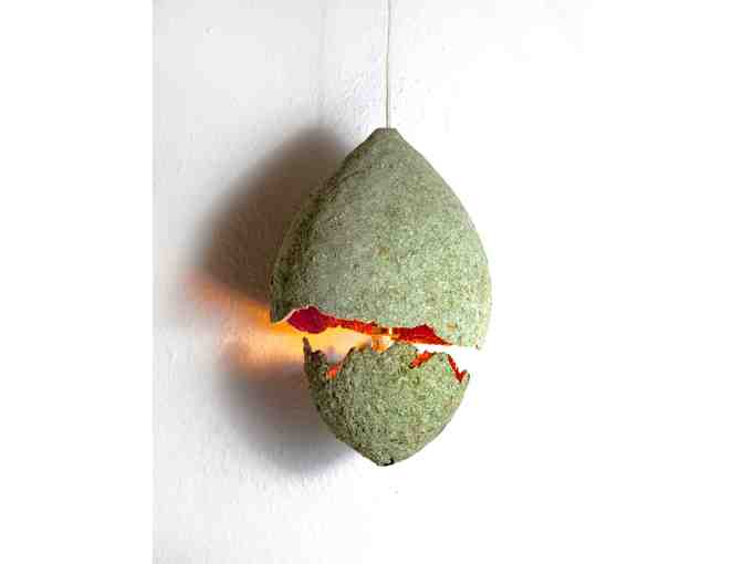 "Solid becomes liquid and rebirths as solid once again. Papier-mâché (chewed paper) is one of our oldest creative mediums, dating back to the Egyptians. The Hatched Pendant is a modern take on an ancient art form."