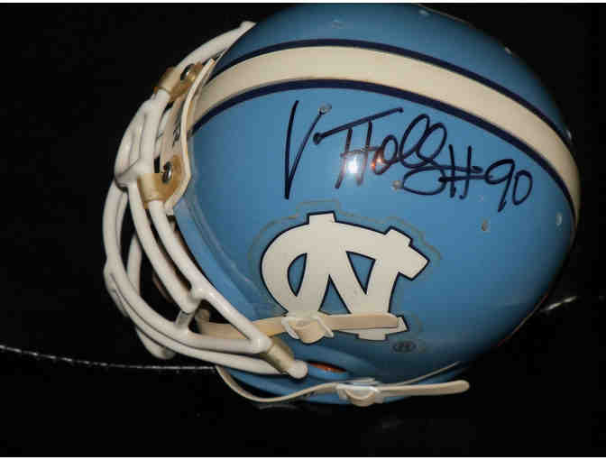 Hard to find North Carolina autographed helmet by DE Vonnie Holiday. This helmet will be discounted due to some yellowing around the decal and chin strap. Display case is included