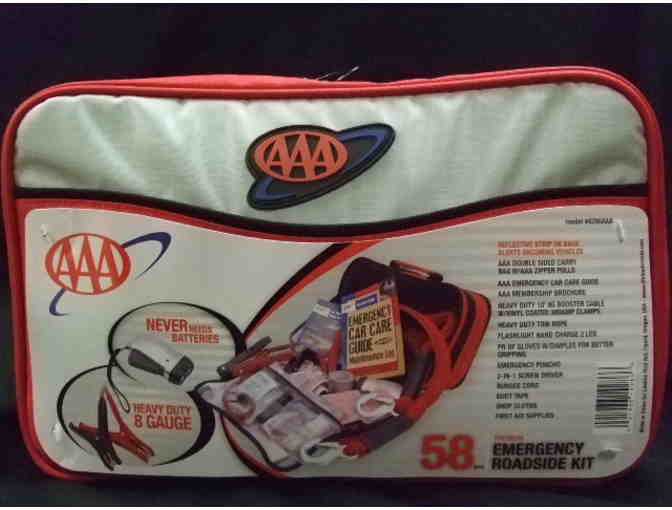 These AAA 70-piece kist contains jumper cables, flashlight, heavy duty tow rope, gloves, emergency poncho, tools, duct tape, shop cloths, first aid supplies and much more. All conveniently packed in a space saving 13" x 8.5" zippered caddy.