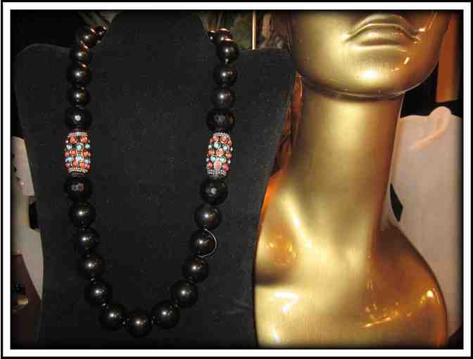 FEATURED COMPONENTS:  Jumbo Black Onyx with 2 Coral Accents and Turquoise, Faceted Black Onyx