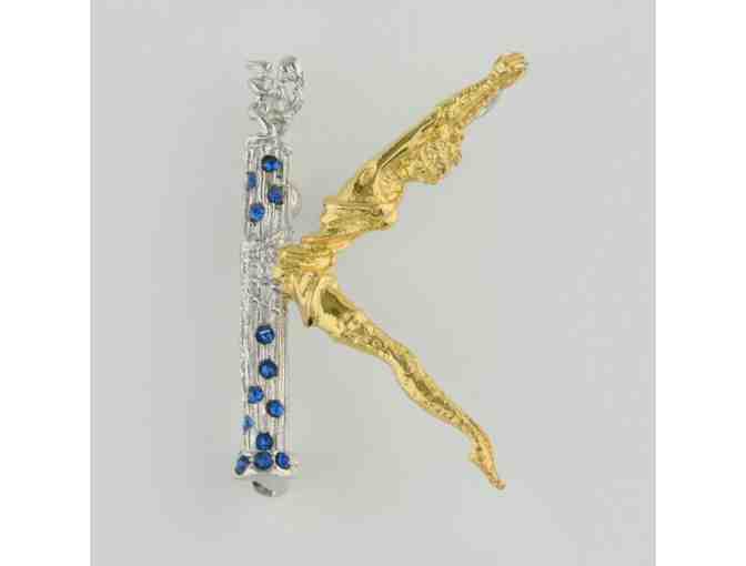 THIS IS YOUR GOLDEN OPPORTUNITY TO OWN A GENUINE ERTE ART DECO CREATION! From an original design by the “Father of Art Deco”, Erte’s famous “Alphabet” series was first a Suite of Serigraphs and then a priceless collection of figures cast in precious metals set with gemstones. We are pleased to present this sparkling Pendant/Brooch depicting the letter “X”, made of solid gold-plated Sterling Silver and hand-set Swarovski crystals, cast from the same mold used to create the original! This piece comes in a simple and pretty gift box with the Erte stamp on it. Officially Licensed by the Estate of ERTE, bearing the official stamp of his signature! Measures approx. 1.5" x 1" (pendant), 2.7 grams (weight). ABOUT THE ARTIST: Born in St. Petersburg in 1892, and expected by his father to follow a military career, Erte confounded the Russian Fleet Admiral by creating his first successful costume design at the age of five. Not until he was 20 years old was Erte finally allowed to move to Paris in 1912 to pursue his passion for fashion. Erte enjoyed a long career as a fashion illustrator for Harper's Bazaar magazine, and gained fame as the creator of gloriously extravagant costumes and stage sets for the Folies Bergere in Paris, and for George White's Scandals in New York. He also designed for the opera and traditional theatre, and made a brief appearance on the Hollywood scene in 1925. |