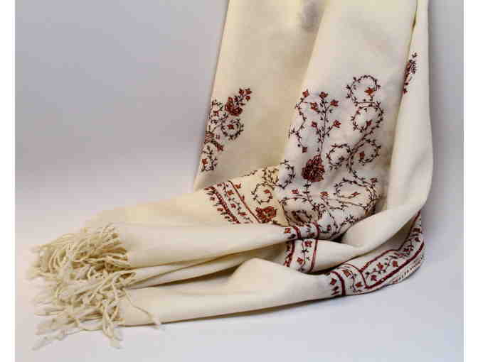 This luxurious pashmina scarf is the perfect fashion accessory for any season, event or occasion! Beautiful Ivory with brown tone hand embroidery accents and 2" fringe.