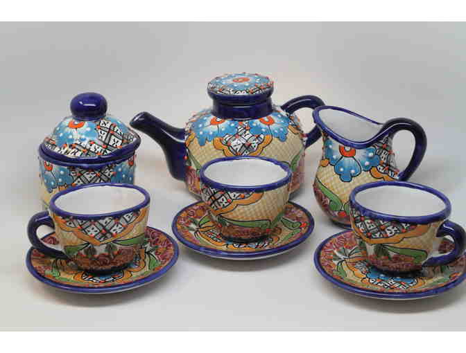 Bring unique vibrant beauty to your home with Talavera pottery direct from Mexico.  Each piece is of our uniquely gorgeous Talavera tea set is hand painted and signed by the artist.  Set includes: six cups & saucers, teapot, creamer & sugarbowl.  Originally introduced by Spanish monks, Talavera is the oldest tin-glazed ceramic in America and it is still being manufactured with the same techniques as in the 16th Century.  Today it ranks among Mexico's most coveted and sought after artisan products.