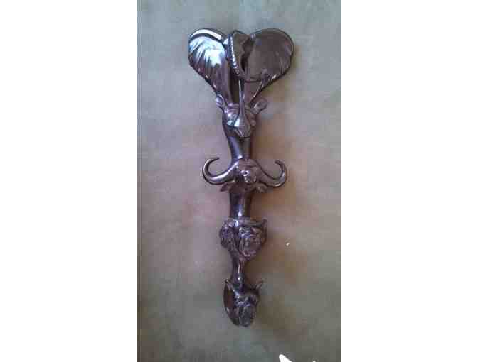 This detailed, elegant sculpture shows an elephant, rhino, buffalo, lion and a leopard head, representative of the "Big Five" that most people hope to see on safari. This one of a kind piece was hand carved of ebony by local craftspeople. Approximately 18x8x6 inches. Please bid generously!