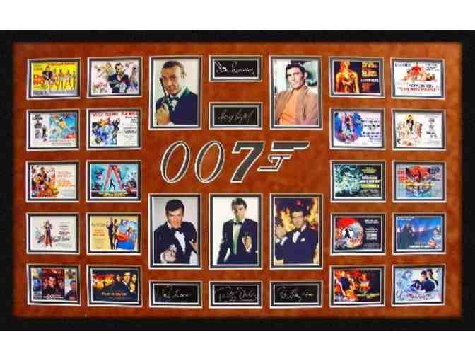James Bond 007 is fictional British spy created by Ian Fleming in 1952. With six different actors playing Bond and twenty 007 movies released to date, the smooth talking undercover spy has been a box office hit for over forty years. This limited edition masterpiece collage captures twenty of the released 007 movie posters and the five retired 007 actors including Sean Connery, George Lazenby, Roger Moore, Timothy Daulton, and Pierce Brosnan and comes professionally double-matted and framed. Certificate of Authenticity included.