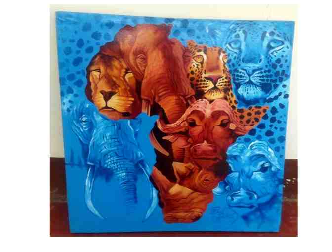 This beautiful painting shows the faces of African Wildlife against a blue background. One of a kind painting created by a local Tanzanian craftsperson. Will be shipped unstretched. Please bid generously!
