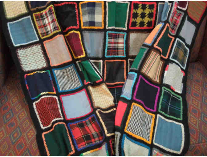 A matching 52" X 70" pieced fabric afghan, with segments crocheted together. The sizes of these two blankets are the same, but the fabric blocks are different. Bid on both to have a colorful, cozy, and useful addition to a guest room or child's bedroom.