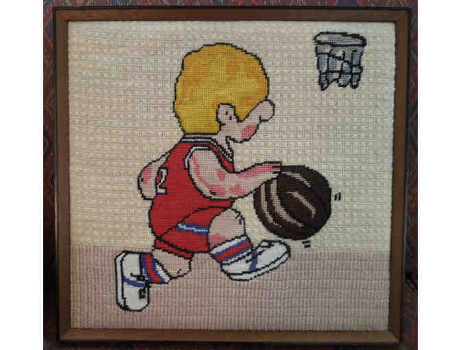 Here's a 15" X 15" needlepoint for the Iddy Biddy Basketballer in your life! Pretty darned cute, as the star of the court you have in mind must be! Stretched and framed without glass so you can see the detail without glare - and so that any Nerf basketballs tossed around the bedroom will do no damage!