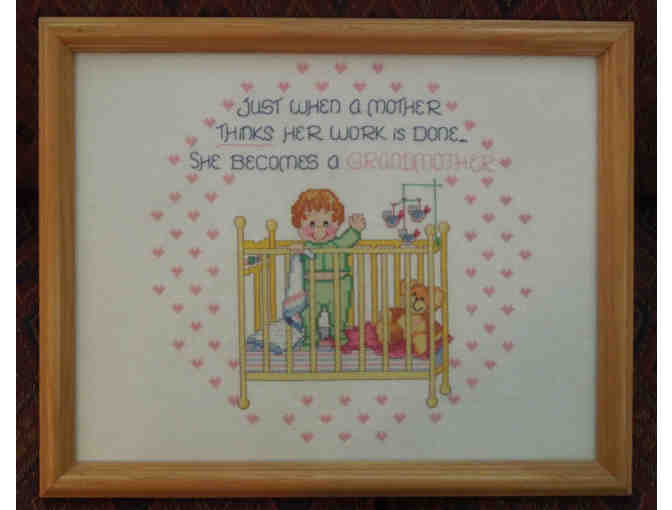 13 1/2" X 15 1/2", this darling piece of handwork is counted cross stitch, framed under glass. Surely you know a new grandmom who NEEDS this! From generation to generation!