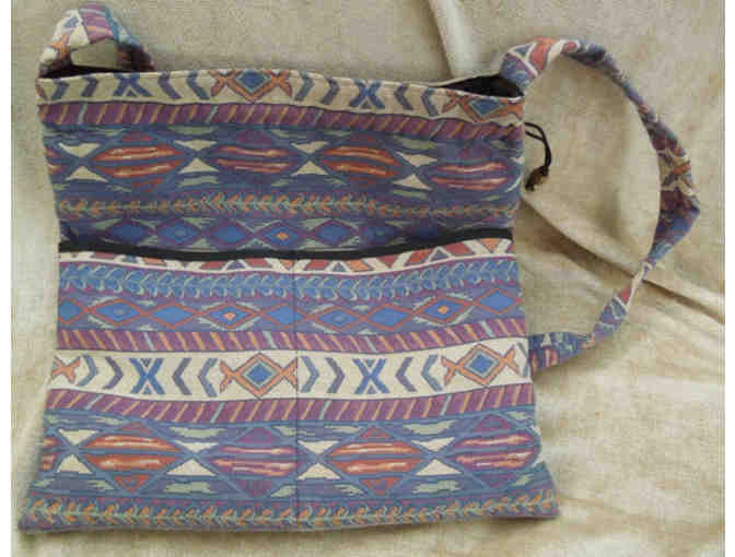 Here's a generous 16" X 16" shoulder bag woven in a Bedouin pattern with two outer pockets and a drawstring top.  It's so roomy that you can load it up for travel.  All cloth, lined in black.  Made in Israel.