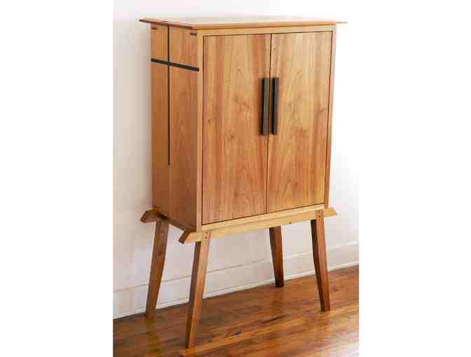 Book-matched door panels and exposed traditional joints highlighted in Walnut distinguish this cabinet.
