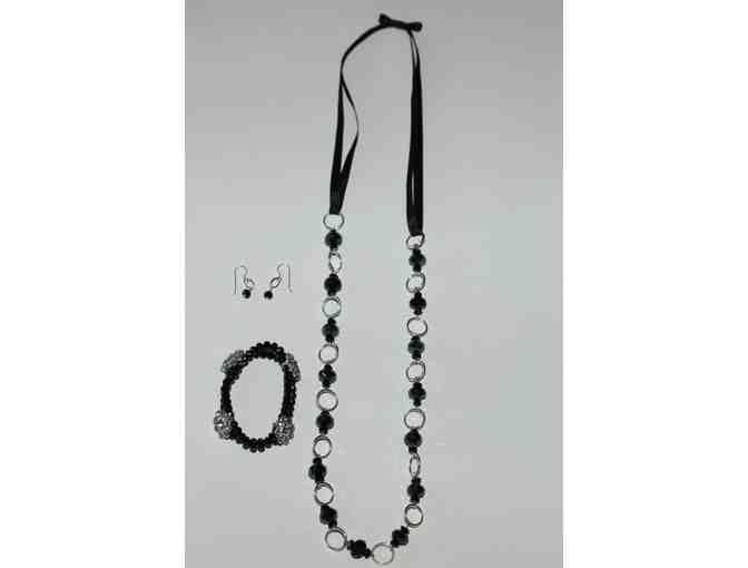 Black Beaded Chain Necklace w/Ribbon Chain, matching Bracelet and Earrings