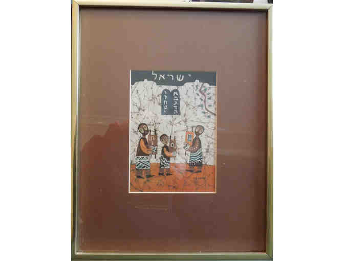 Ami Goldfarb's iconic Jewish images are showcased here in the print here made from an original batik painting. The piece is 11" X 14", framed in gold, with the central a 5 X 7 print within a brown mat. The Hebrew text at the top of the print reads "Yisrael" and the imagery includes the tablets of the 10 Commandments and three people holding Torah scrolls. There is minor scratching on the frame, but the print and mat are in excellent condition.
