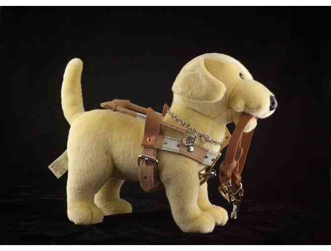 Tilly is a yellow lab, looking for a home. She's standing in her harness, holding her lead in her mouth and ready for work. Looking into her big brown eyes and feeling her black nose nudging you, you can hardly wait to walk with her. She's small enough to fit in a backpack if she gets tired or sleep on your pillow at night. Wearing her round, wooden name tag, “Tilly” is ready to roll.