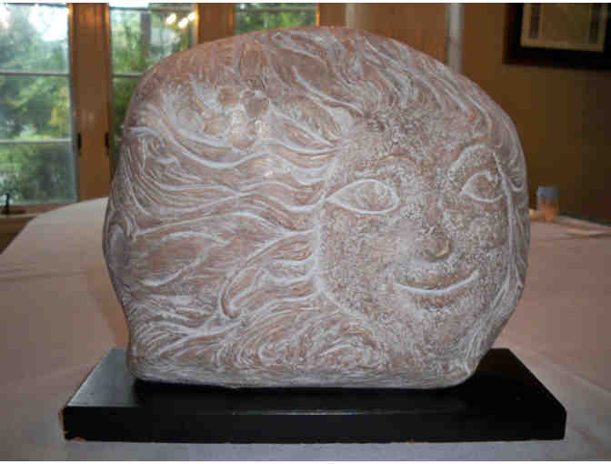 This unique piece is a carved stone table sculpture featuring the moon on one side and the sun on the other - perfect for your changing moods! Warm soft grey and white surfaces, mounted on a wood base with surface-protecting bumpers below.