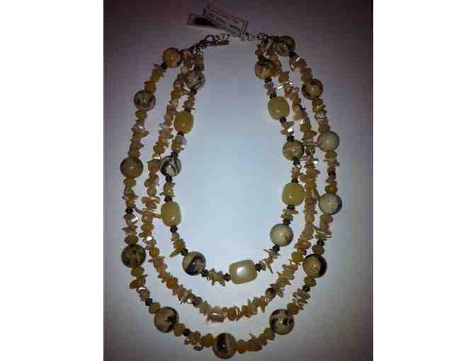Three strand necklace of natural stone. Tan, beige with silver beads intermixed.