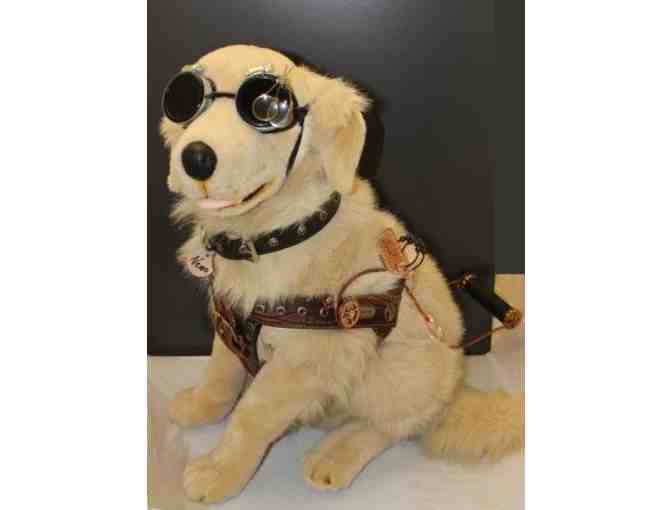 Steampunk fans, start drooling. Nemo, the golden retriever, is outfitted in full Steampunk regalia. His style is a little bit of Jules Verne combined with H.G. Wells. Can you imagine your Seeing Eye guide decked out in goggles trimmed with metal pipe cinching and two added magnifier lenses? Nemo's thick leather collar dangles a copper metal wheel. His Victorian-style harness is also of copper, rather than leather, and is decorated with copper wheels, gears, grommets, and glass beads. It boasts an ornate leather handle with brass studs. Only his outfitter, Hava Hegenbarth, could have created a character like Nemo, who will surely spark feverish conversations, if not a whole genre.