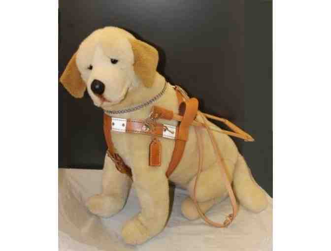 This quizzical looking plush yellow lab is wondering if you're set to go. She is seated in hand crafted, replica Seeing Eye harness, with her chain collar and leather lead attached. Her name, Pilar, is displayed on her round wooden tag, and she is signed on a leather tag by talented artist, Hava Hegenbarth, who handcrafted all of Pilar's equipment. Her brown eyes and black nose practically quiver with excitement and affection.