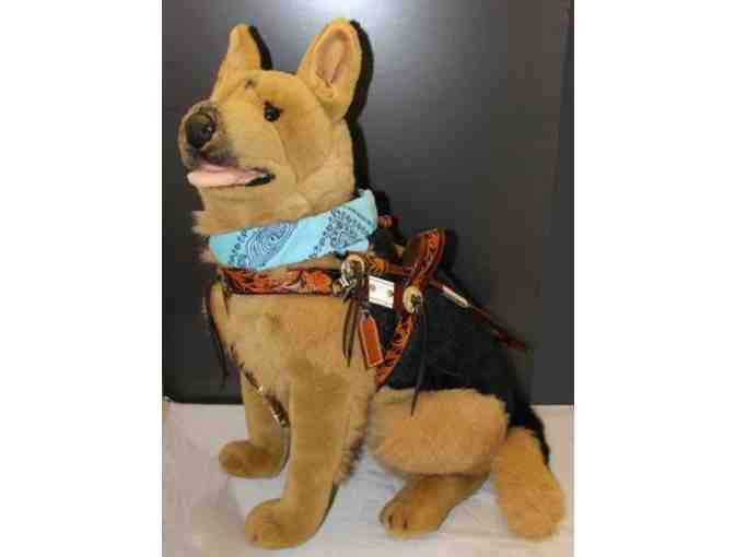 Tall, dark, handsome, alert—who could ask for anything more? This seated plush German Shepherd looks every bit the urban cowboy. His ears are pricked up and his tongue is out. His beautiful black and tan coat is complemented by a hand-tooled, western-style guide dog harness with silver ornaments and buckle that any real dog would envy. He wears a light blue bandana over his metal chain collar and is leashed with a luxurious, leather lead. His name tag says, “Cinch” for he's a cinch to win the heart of any Seeing Eye dog owner, raiser, trainer, or fan.