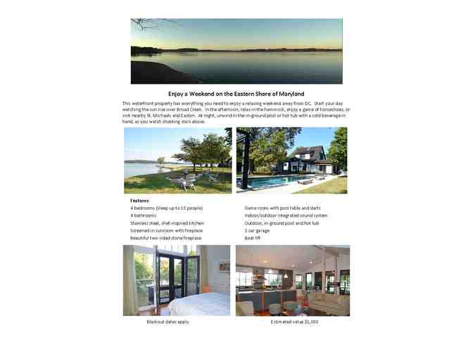 This 4 bedroom, 4 bathroom waterfront house has everything you need to enjoy a relaxing weekend on the Eastern Shore of Maryland. The house features an outdoor pool and hot tub, game room with pool table and darts, integrated sound system, chef-inspired kitchen, and beautiful views of the water. Your stay includes 2 days and 2 nights on your choice of the following weekends in 2014: 3/14-3/16, 4/18-4/20, or 5/23-5/25. Terms and conditions: 8 people maximum. No smoking or pets. Please note that in addition to the winning bid, there is a $1,000 refundable damage deposit. Please email akr2v@yahoo.com at least 10 days in advance of your desired weekend to confirm your reservation