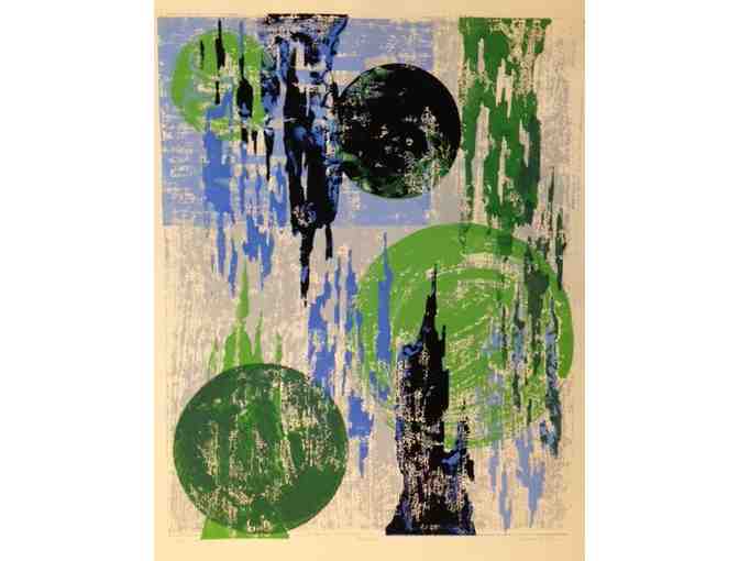 This block-print was made with water-soluble inks, a kind of guache. Because of this no two prints are exactly alike. The occasional slight wave in the paper is one of the characteristics of such graphics.