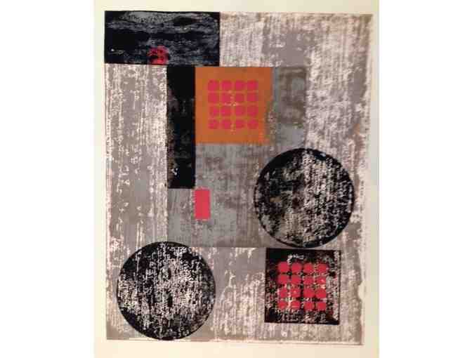 This block-print was made with water-soluble inks, a kind of guache. Because of this no two prints are exactly alike. The occasional slight wave in the paper is one of the characteristics of such graphics.