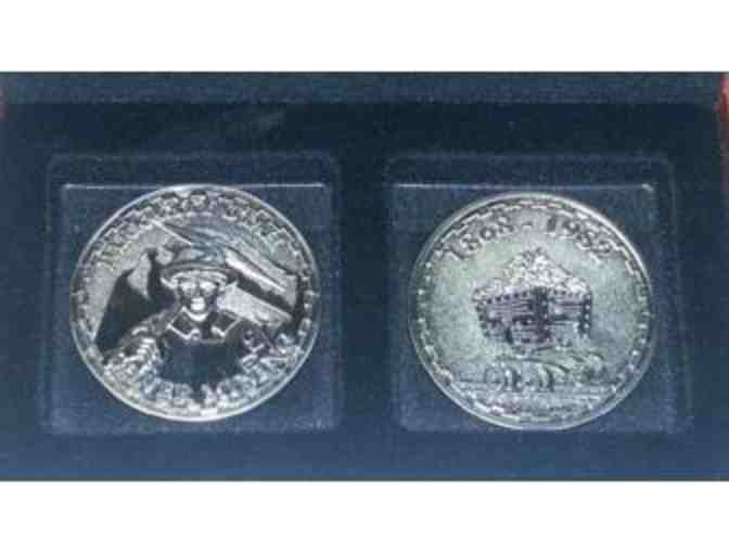 Jane Riley, a Summit County local and Park City Museum volunteer, thought it was time to honor the areas mining history by designing a commemorative coin. The second antiqued silver coin features a young miner holding a pick axe and mountains in the background. On the backside of the coin is a loaded ore cart as well as the areas mining productions dates. A pair in a special wooden box.