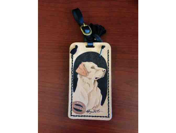 Hand Tooled and Dyed Leather Tag Featuring a Yellow Labrador Retriever