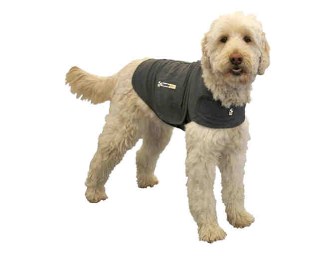 Is your dog a “fraidy-cat” when it comes to thunder, separation, travel, fireworks, and other common fears? Perhaps you've tried tranquilizers and behavior modification to overcome these anxieties? The doggie Thundershirt is a vet-tested remedy for relief of canine anxiety. This stretchy constriction garment reassures pets and relieves such symptoms as panting, shaking, drooling, excessive licking, bolting, or indoor elimination. The Thundershirt is sized extra-large for dogs with chest size 30-37 inches, approximately 65-110 pounds. Grey.