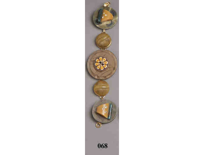 One-of-a-kind bracelet made from vintage buttons and jewelry by the artist Ruth Sack. This bracelet contains celluloid and bakelite elements on a brass bezeled base 7.5" long. Please bid generously!