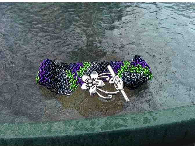 This diagonal patterned mesh bracelet features purples, greens and gray and black for a dramatic accessory to your wardrobe.
